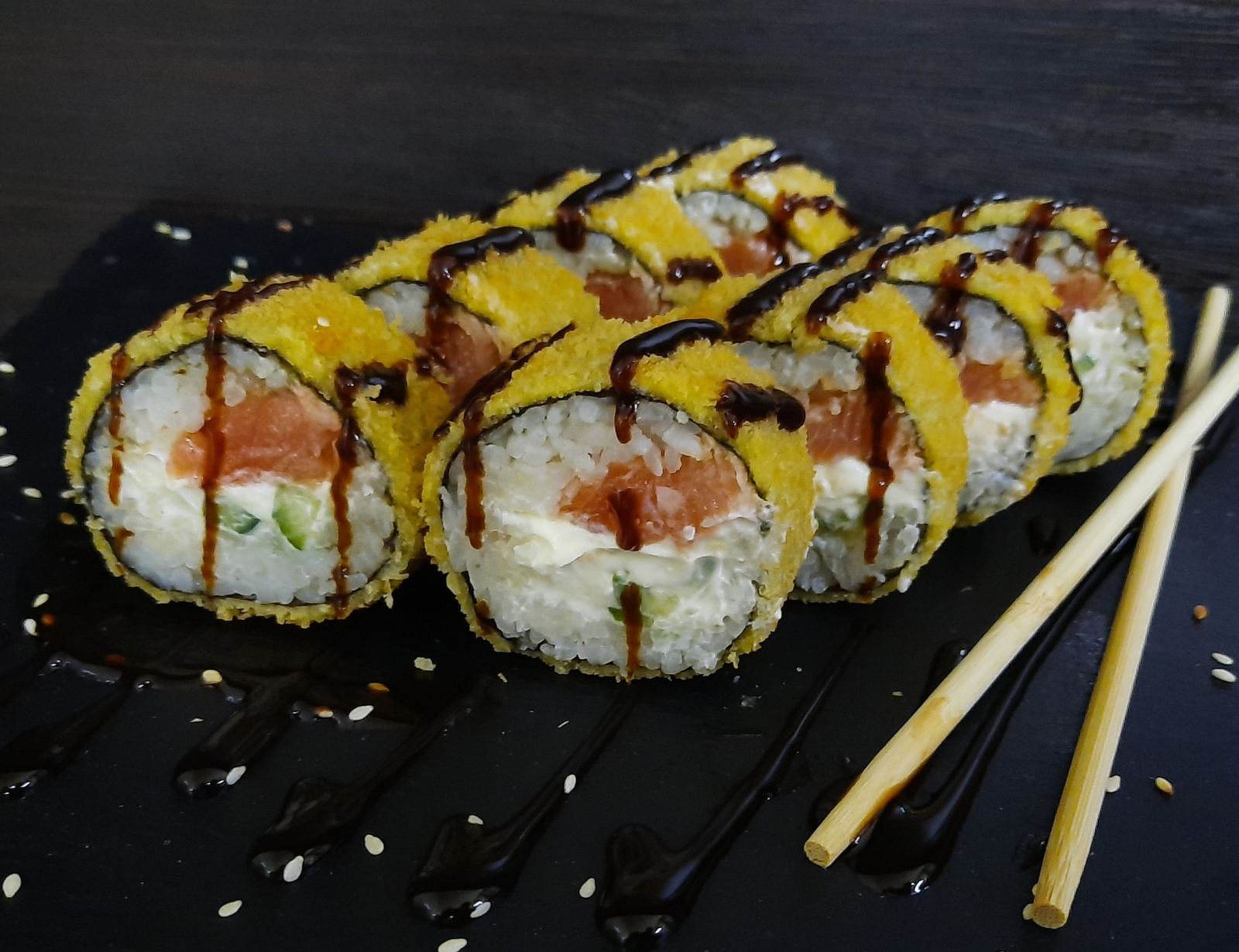 Рис,норі,лосось,вугор,сир Філадельфія,огірок,сухарі Панко,Унагі соус