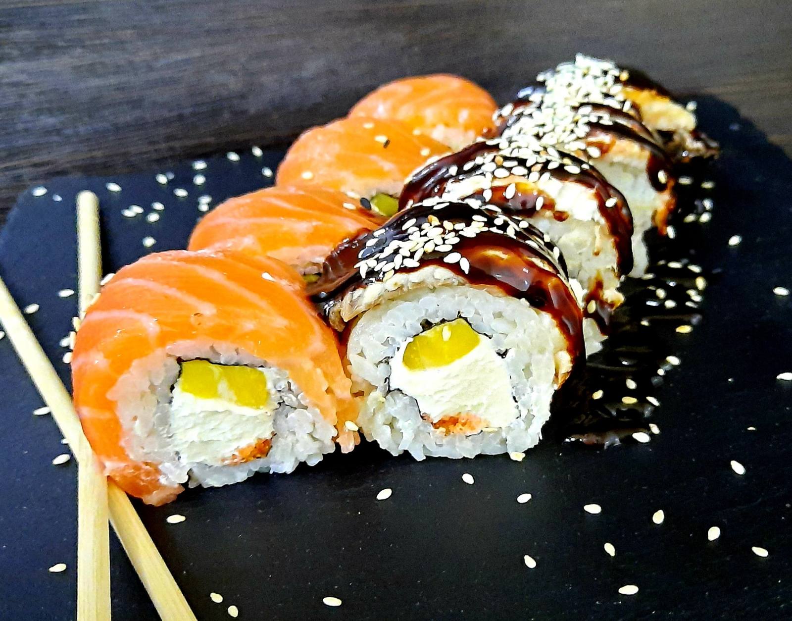 Рис,норі,лосось,вугор,ікра Тобіко,манго,сир Філадельфія.