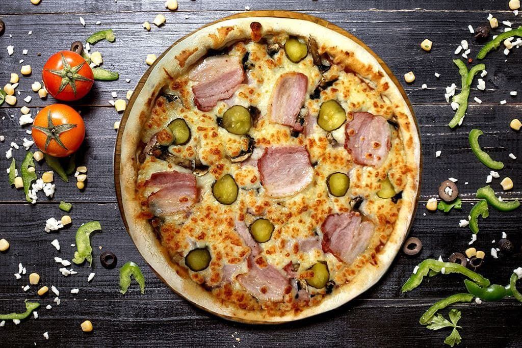 Соус барбекю,шинка,печериці,бекон.солоні огірки.сир Моцарелла