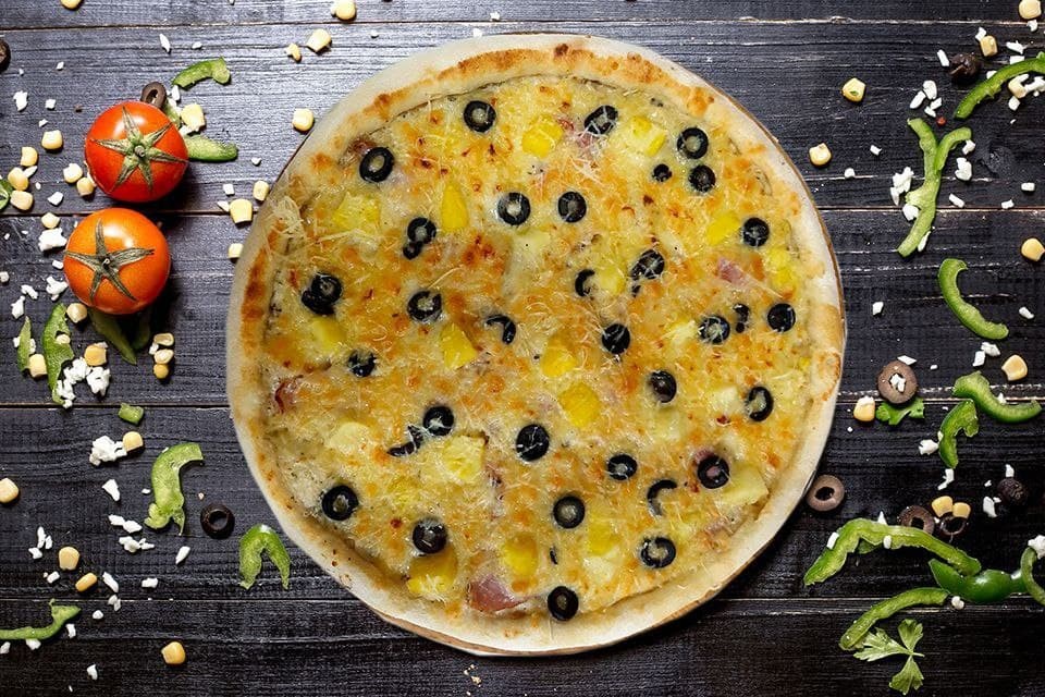 Соус фірмовий білий, шинка, ананас, маслини, сир Моцарелла, сир Пармезан.