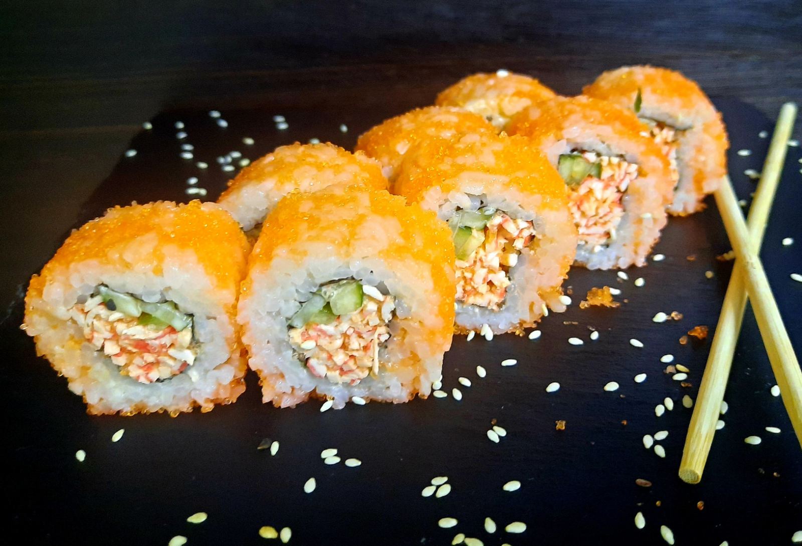 Рис,норі,краби,огірок,ікра Тобіка,соус Спайсі.