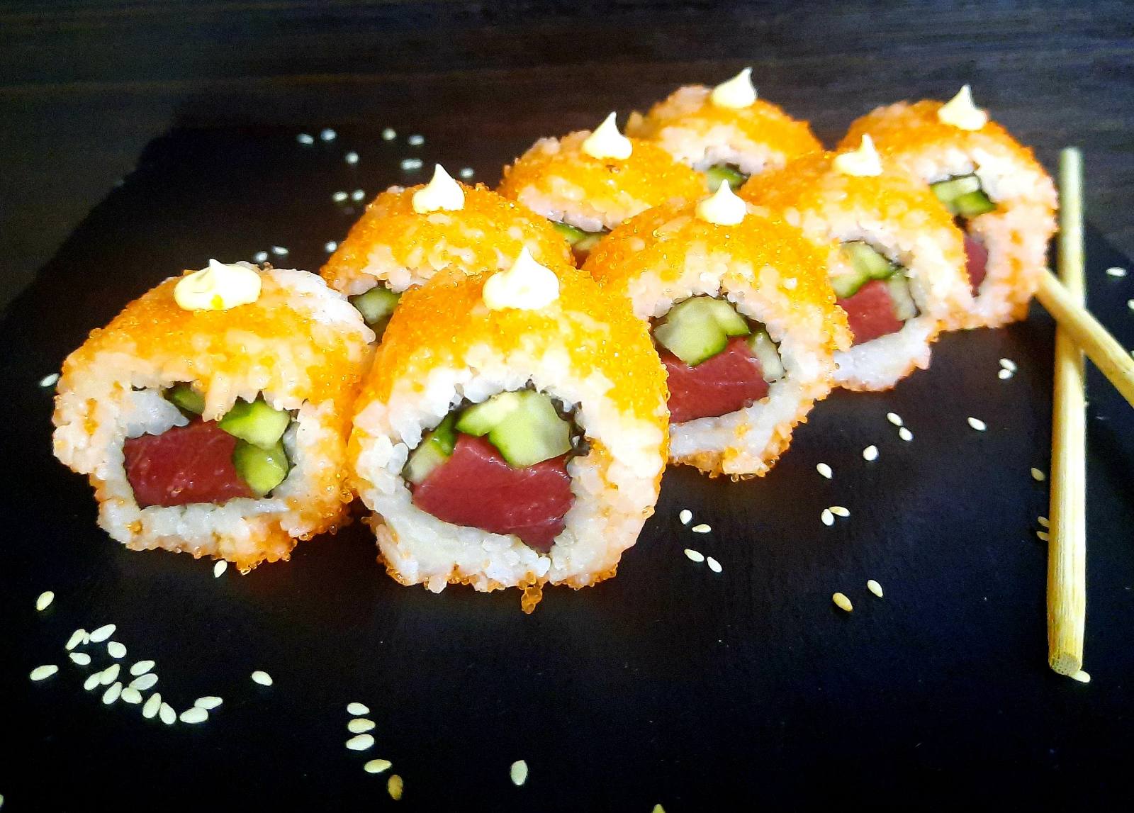 Рис,норі,тунець, ікра Тобіка, соус Спайсі,огірок.