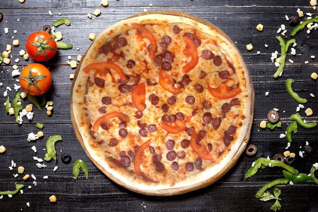 Соус томатний,мисливські ковбаски,помідори,сир Моцарелла ,сир Гауда.