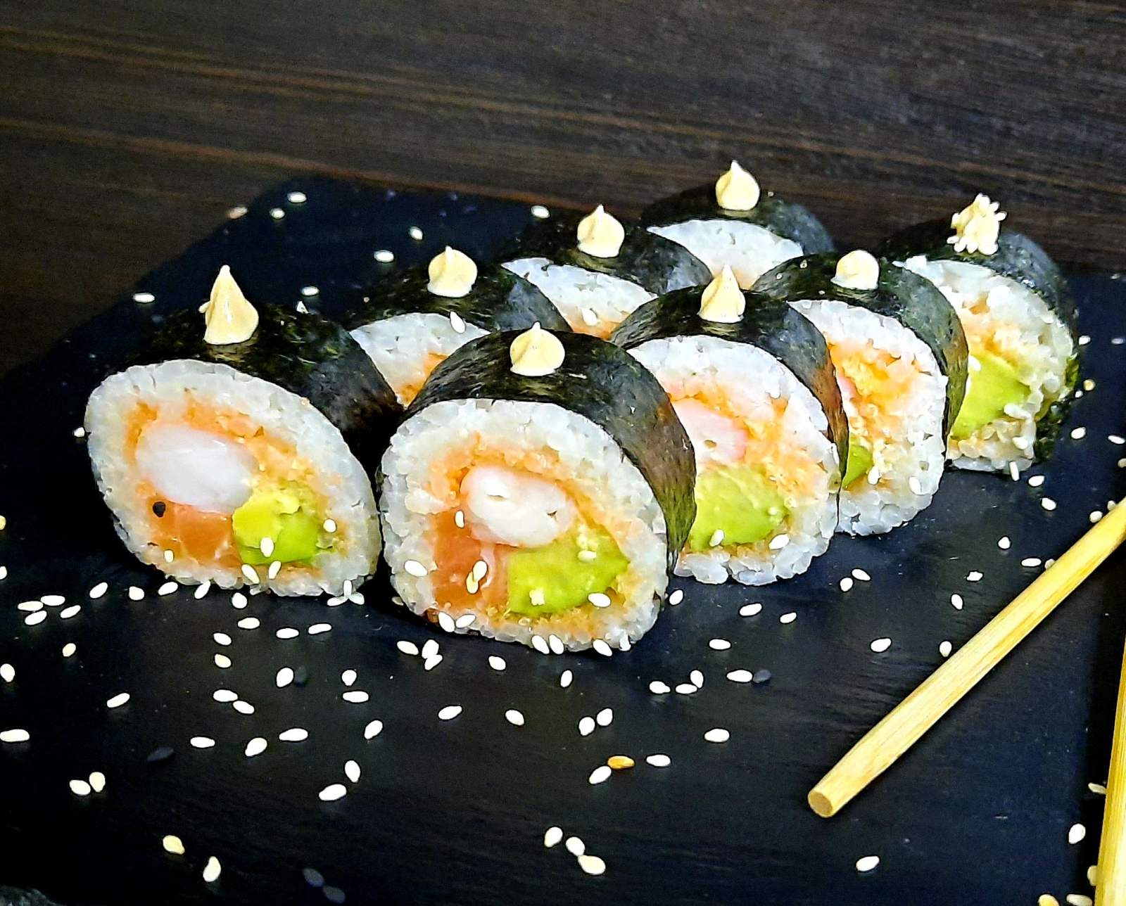 Рис,норі,креветка,лосось,авокадо,ікра Тобіко,Спайсі соус.