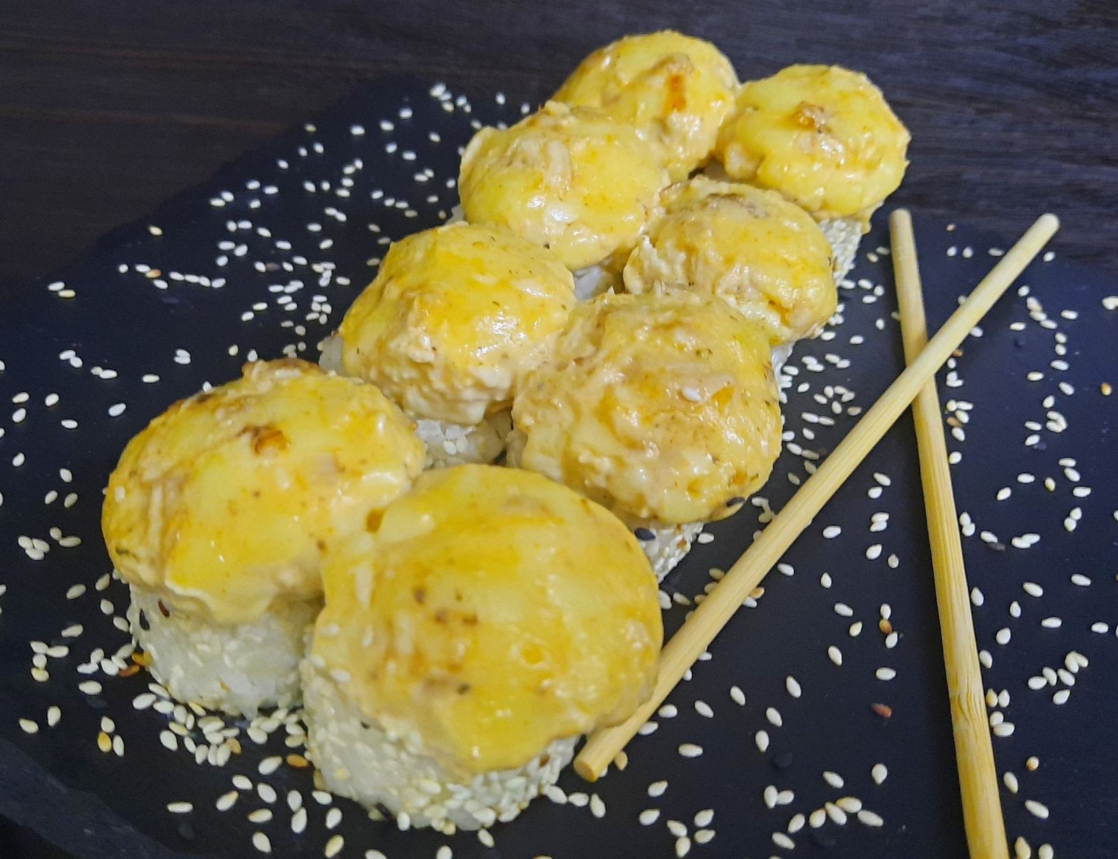 Рис,норі,курка,огірок,сир Філадельфія,сир Моцарела,соус Спайсі.