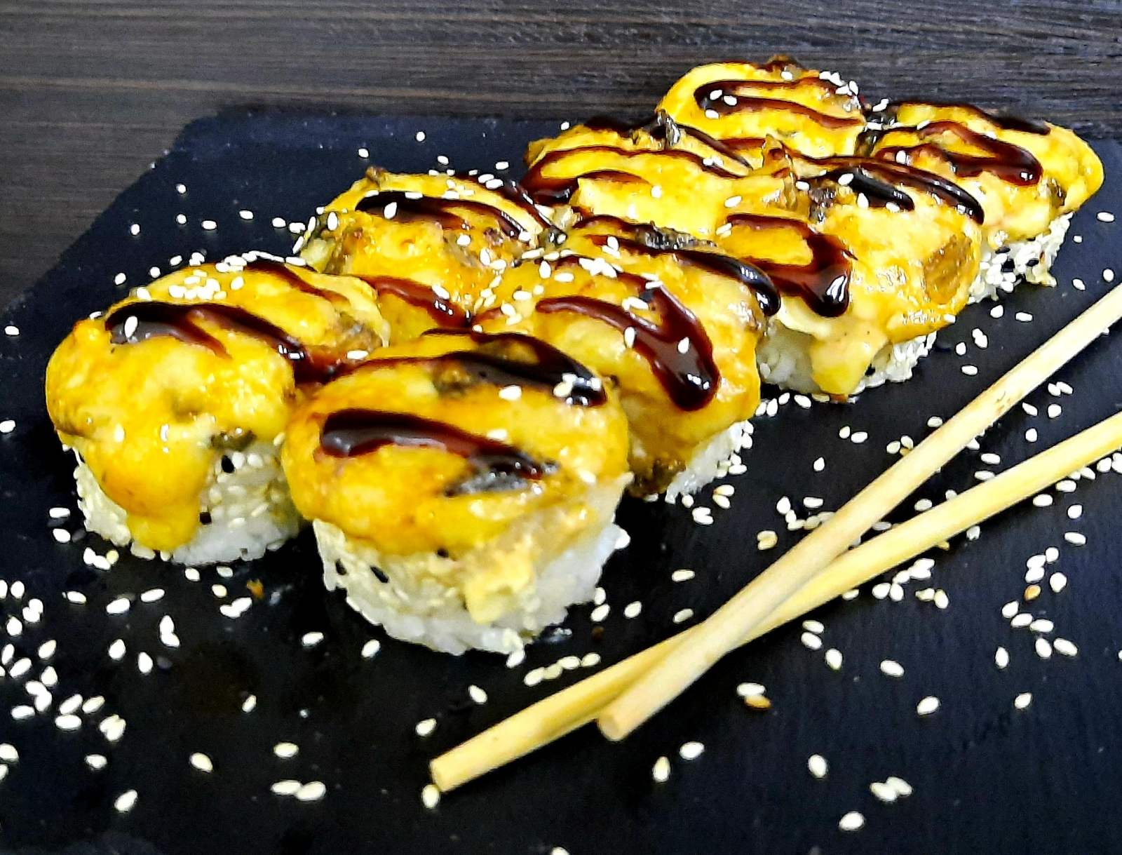 Рис,норі,сир Філадельфія,сир Моцарела,вугор,соус Спайсі,огірок,кунжут,унагі